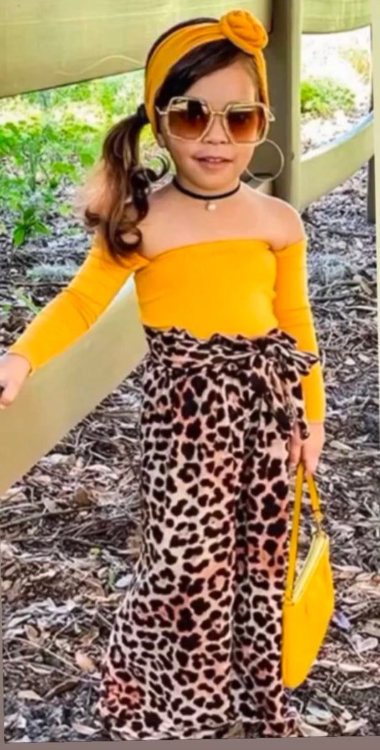 Girls 2 Pcs Orange Leopard Pants Set w/belt and Head Tie